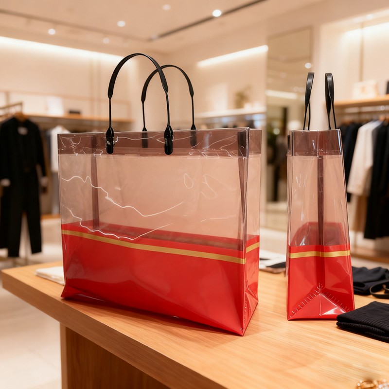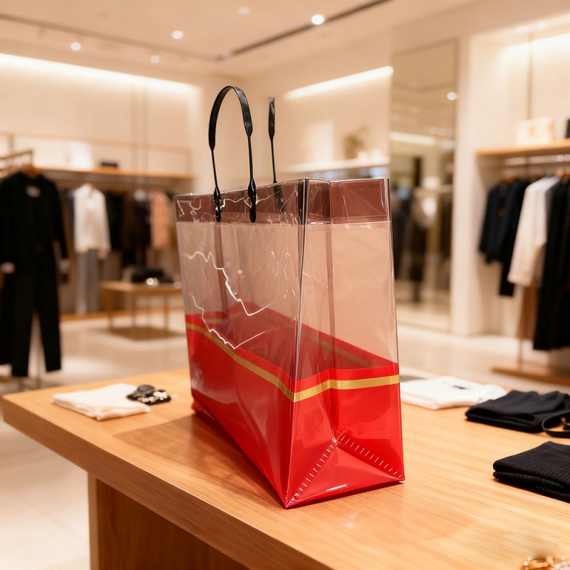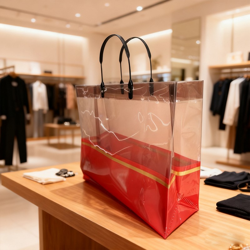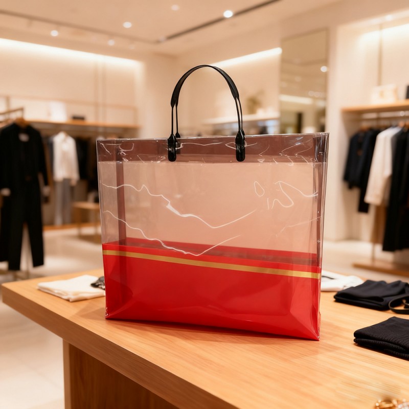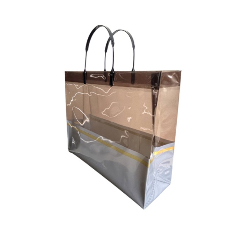 Einzelhandel und Modeboutiquen: Ideal als Luxus-Einkaufstasche für Kleidung, Accessoires und Kosmetika. Steigert den wahrgenommenen Markenwert und verbessert die Kundenzufriedenheit durch sein hochwertiges Erscheinungsbild. Firmengeschenke und Veranstaltungen: Perfekt zum Verpacken von Geschenksets, Werbeartikeln oder Werbegeschenken für Veranstaltungen. Die Goldbanddekoration passt zum Thema High-End-Marken und eignet sich daher für die Unternehmenswerbung. Täglicher Gebrauch und Reisen: Die Tasche ist leicht und faltbar und dient als stilvoller Begleiter für Einkäufe, Strandausflüge oder Freizeitausflüge. Seine Transparenz ermöglicht eine einfache Identifizierung des Inhalts und ist praktisch für den täglichen Gebrauch. Ausstellungen und Messen: Als wandelnde Werbung fungieren, wenn sie mit Markenelementen personalisiert werden, und Aufmerksamkeit erregen, während Materialien oder Muster verteilt werden. Hilft bei der Sichtbarkeit der Marke und der Interaktion mit potenziellen Kunden.